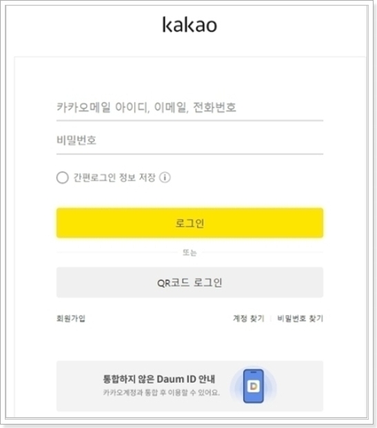 다음 메일 로그인은 이제 카카오계정으로 통합되었기 때문에 예전 방식과 조금 달라졌어요. 기존 다음 아이디로는 바로 로그인되지 않고, 카카오계정과 연동해야 메일을 확인할 수 있게 되어 있어요.